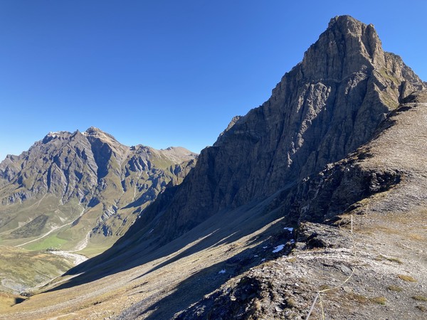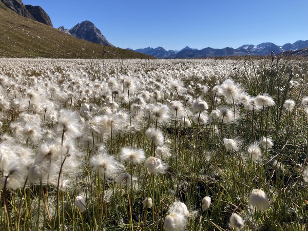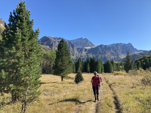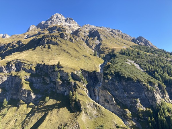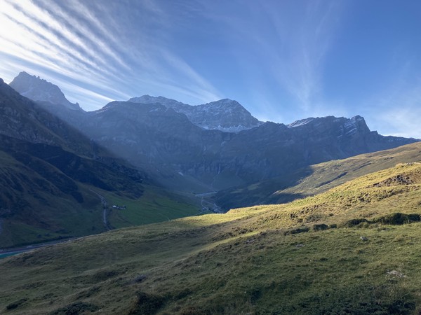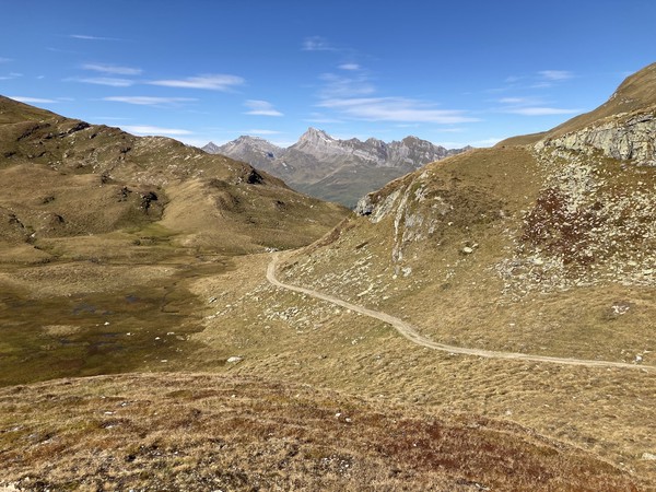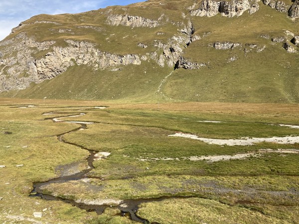 Der Weg führt über den Bergwald steil nach oben. Sobald man aus dem Wald herauskommt, wird das Hochtal etwas breiter und gibt den Blick auf eine faszinierende Landschaft frei: durch die Bergwiesen sucht sich das türkisblaue Wasser des Riedbodabaches seinen geschlungenen Weg. Auf der höher gelegenen Geländestufe und unterwegs zur Passhöhe liegt die Tomüllalp.