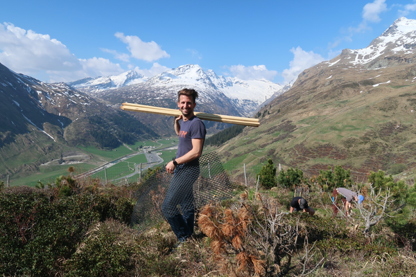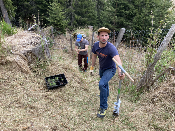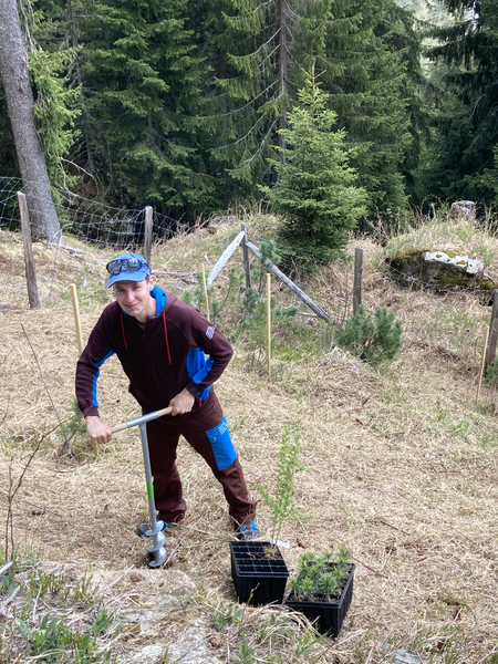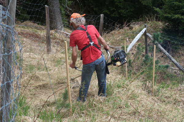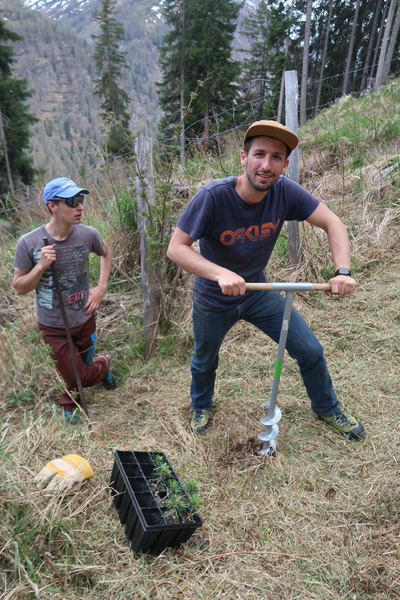 Ein sonniger Samstagmorgen lockt uns früh aus den Federn. Nach einem ausgiebigen Frühstück wird der Anhänger mit den Pflanzen, Akazienpfählen, Schutzgittern und allerlei Werkzeug beladen. Inzwischen ist auch Marco mit seinem neuen Motorrad bei uns eingetroffen. Nun sind wir komplett und fahren zu fünft zum Standort Tristel. Wir pflanzen insgesamt 15 Arven und 15 Lärchen in die Lücken, die durch die abgestorbenen Bäume entstanden sind. Wir verleihen der Pflanzung ein kompakteres Erscheinungsbild und die Lärchen lockern den Arvenbestand auf. Alle Jungpflanzen werden mit Wasser aus dem nahegelegenen Bächlein ausgiebig getränkt und mit einem Einzelgitter geschützt. Vor dem nächsten Winter muss der Zaun um die Pflanzung frisch aufgerichtet und verstärkt werden.