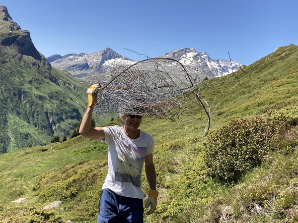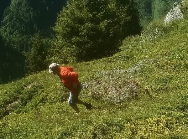 Wir haben wieder Wetterglück und ein strahlendes Wochenende steht uns bevor. Im ganzen Land sind überall Openair-Veranstaltungen angesagt, vom Grümpelturnier über Autorennen am Hemberg, Schwingfest in Wil, Frauenlauf in Bern bis zu diversen Blues- und Rockkonzerten überall. Dies mag ein Grund dafür sein, dass wir diesmal nur zu dritt, d.h. Andreas, Iso und Christoph, im Arbeitseinsatz sind. Voller Tatendrang begeben wir uns auf die Alp Piänetsch, wo wir die Alpweiden nach herumliegenden Maschendrahtgittern, Stacheldraht und Pfählen durchkämmen. Es ist unsere Aufgabe als Verein, diese Altlasten zu entsorgen, damit sich Vieh und Wildtiere nicht verletzen können. Einzelne Gitter können wir nur mit Hilfe eines Pickels und zu zweit vom Dickicht befreien, weil sie so stark mit Gras und Alpenrosenstauden überwachsen sind. Es ist eine mühsame und schweisstreibende Arbeit und jeder von uns hat seine eigene Methode, die vergammelten Maschengitter bis zum Depot beim Drehkreuz am unteren Ende der Alp Piänetsch hinaufzutragen, wo sie auf den Abtransport mit einem Geländefahrzeug warten.