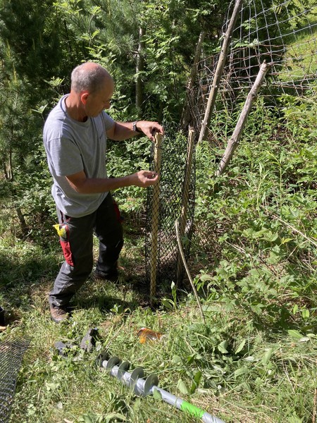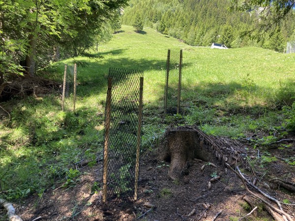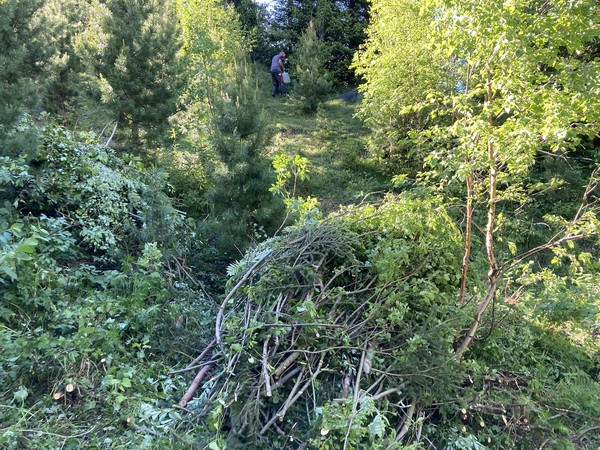 Am Samstagmittag reist Andreas wieder ab. Mit dem Ziel, die restlichen 45 Arven und Lärchen zu pflanzen, begeben wir uns also noch zu zweit ins Nimmeliweiss. Über dem Feuer braten wir unsere Würste und Maiskolben und stärken uns für die Weiterarbeit. In der Einzäunung erwartet uns ein eigentlicher Urwald. Wir kommen nicht darum herum, zuerst einmal mit der Motorsäge die Weiden, kleinen Fichten und jungen Birken zu roden, um Platz für die Neupflanzung von Arven und Lärchen zu schaffen. Bis am Abend können wir lediglich ca. 25% des ganzen Gebietes aufräumen. Ein feines Nachtessen im Hotel Suretta in Splügen und ein Feierabendbier beendet einen überaus schönen, aber körperlich anstrengenden Tag.