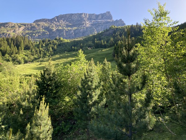 Iso und mir ist bald klar, dass wir unsere geplante Wanderung am Sonntag streichen müssen, um wenigstens die Hälfte der Bäumchen pflanzen zu können. Einige Exemplare setzen wir auch ausserhalb der Einzäunung am Rande der Alpweide und am Waldrand. Die restlichen 20 Bäumchen schlagen wir an einem schattigen Ort im Garten ein, um die Wurzelballen vor dem Eintrocknen zu schützen. Sie warten nun dort auf den nächsten Arbeitseinsatz und ihre definitive Verpflanzung. Am frühen Nachmittag reisen wir wieder ab, um dem Stau des Rückreiseverkehrs zu entrinnen.