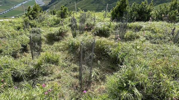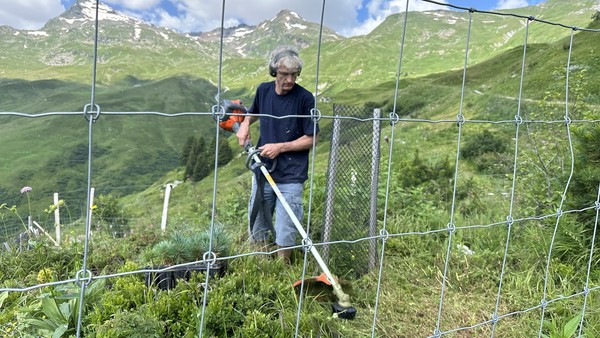 Die erste Hälfte des Sommers 2024 war geprägt von häufigem Regen und stabile Tage waren Mangelware. Am 15. Juni musste der geplante dritte Arbeitseinsatz sogar abgesagt werden. Mit dem Klimawandel nimmt die Intensität und die Häufigkeit von Starkniederschlägen zu. Den Arven gefiel zwar das nasse Sommerwetter, dem Unkraut aber leider ebenso. Letzteres wucherte dermassen, sodass Andreas und ich spontan oberhalb Hinterrhein einen Arbeitstag durchführten.