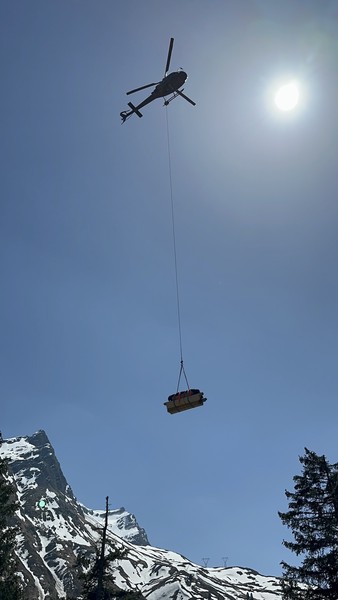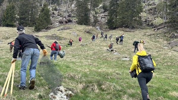 Um die menschlichen Kräfte im steilen und unwegsamen Gelände zu schonen, übernahm ein Helikopter am Vortag unseres ersten, diesjährigen Arbeitseinsatzes den Materialtransport zu zwei Depots im Wald. Zudem markierten Andreas, Iso und Christoph mit verschiedenfarbigen Akazienpfählen die sorgfältig ausgesuchten Pflanzstandorte. Am Samstagmorgen versammelte sich die rekordhohe Zahl von 22 Helferinnen und Helfern auf dem Parkplatz vor dem Tunnelnordportal - viele neue Gesichter waren dabei. Zwei Jäger absolvierten ihre obligatorischen Hege- und Pflegestunden bei uns, dazu kamen zwei Gäste aus dem Glarnerland und vier Neumitglieder. Die Stimmung war geprägt von Neugier und dem Wunsch, etwas Gutes zu bewirken. Nach einer kurzen Einführung machten sich die Freiwilligen, ausgestattet mit Pflanzen und Werkzeugen, in drei Gruppen auf den Weg den steilen Hang hinauf zu ihren Arbeitsorten. Die Hilfsbereitschaft innerhalb der Gruppen war beeindruckend – es wirkte, als würden hier eingespielte Teams zusammenarbeiten. Mit grossem Engagement und sichtbarer Freude packten alle tatkräftig mit an.