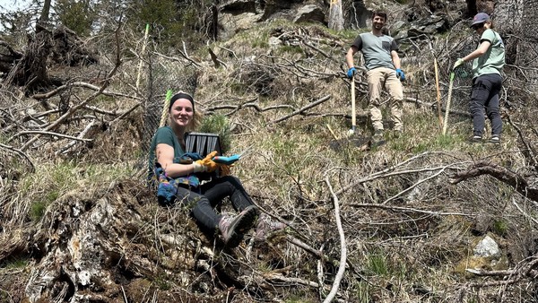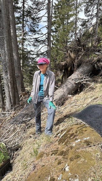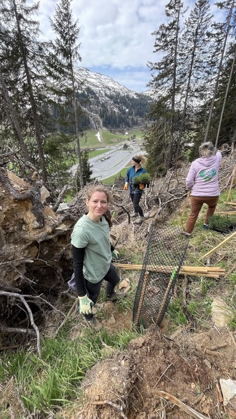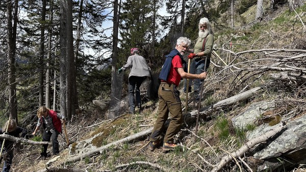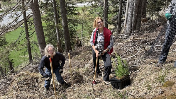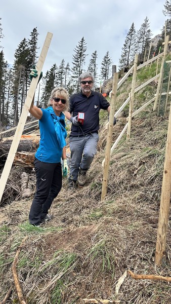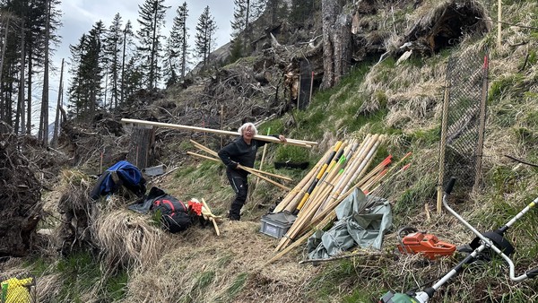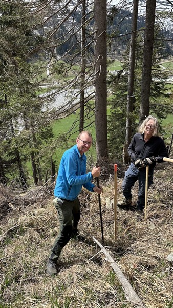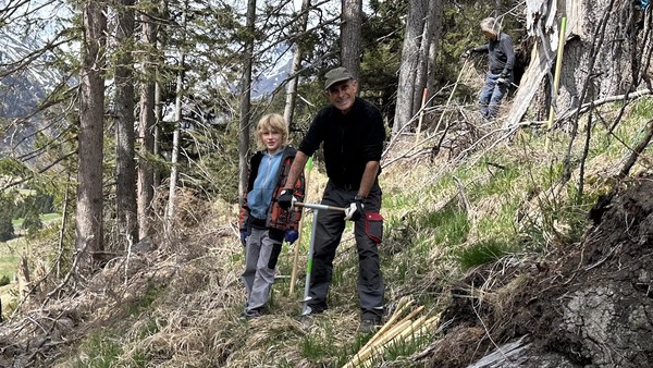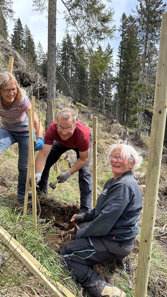 Mit der gezielten Mischung von Arven, Lärchen und Bergahorn wollen wir die Biodiversität fördern und die Anpassungsfähigkeit des Waldes an den Klimawandel verbessern. Denn solche Mischbestände sind widerstandsfähiger gegenüber Schädlingen und Krankheiten. Die Pflanzung der Bäume in einem Einstandsgebiet stellt die Vereinsmitglieder vor spezielle Herausforderungen, insbesondere hinsichtlich des Schutzes der Jungpflanzen vor Wild-verbiss. Allein für den Schutz von Bergahorn verbaut der Verein 150 Pfähle, 750 Meter Dach-latten und 200 Meter Knotengeflechtgitter.