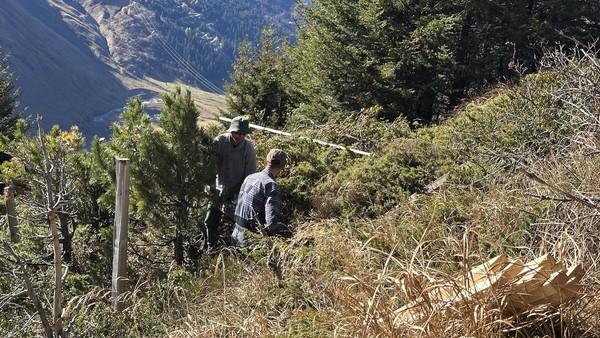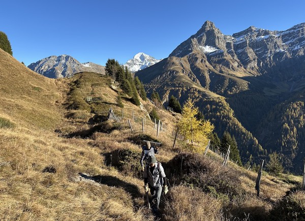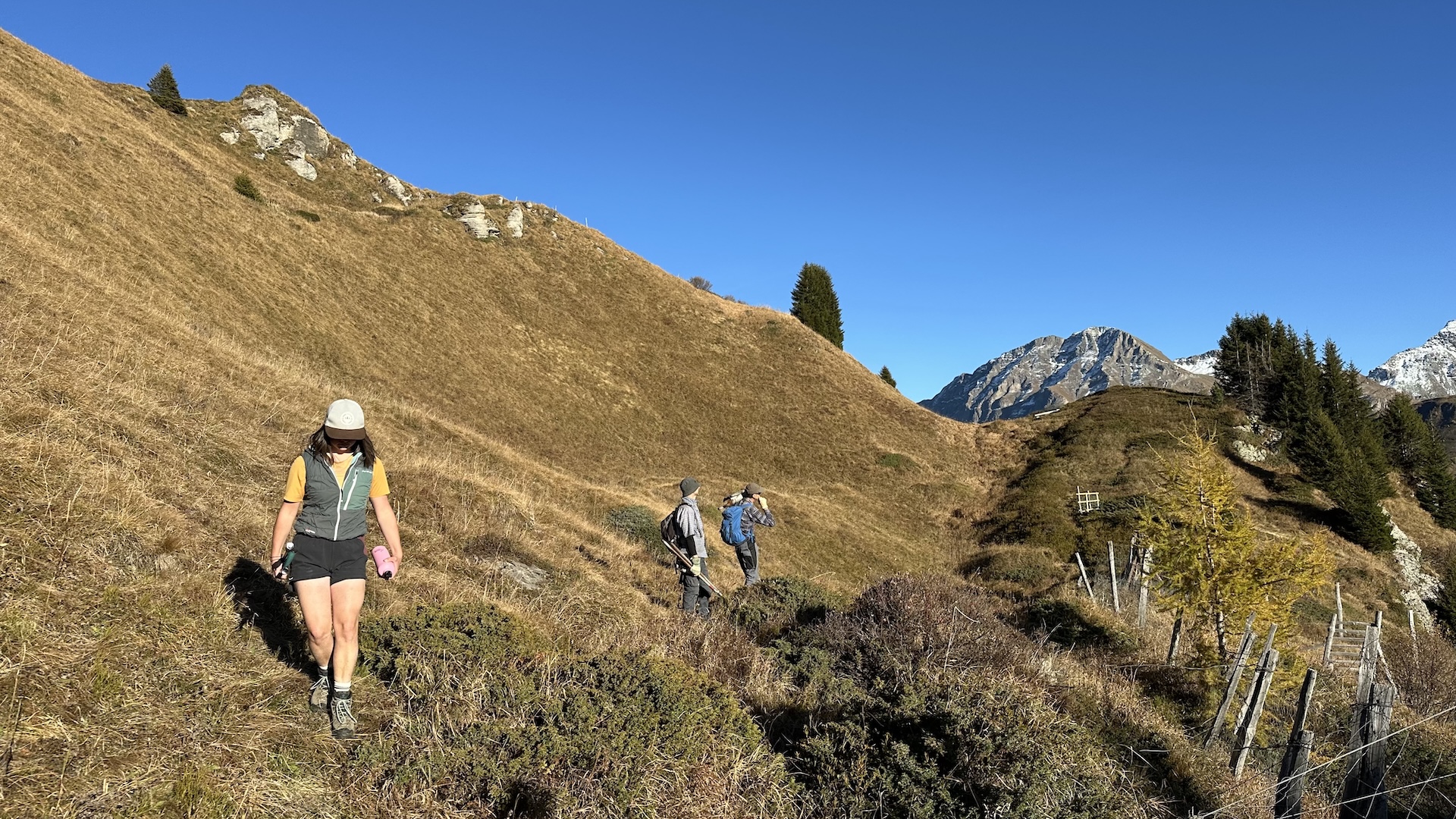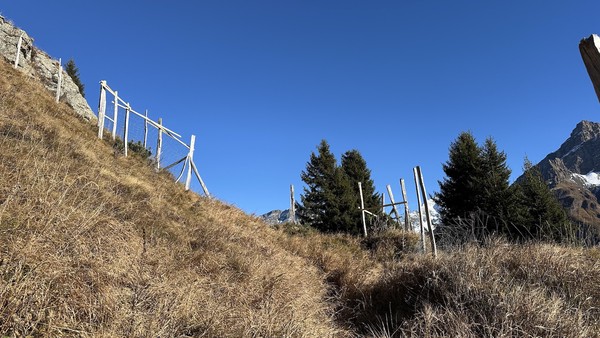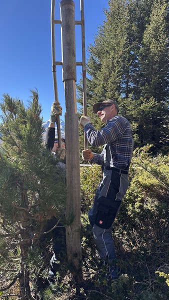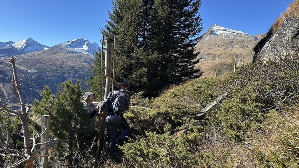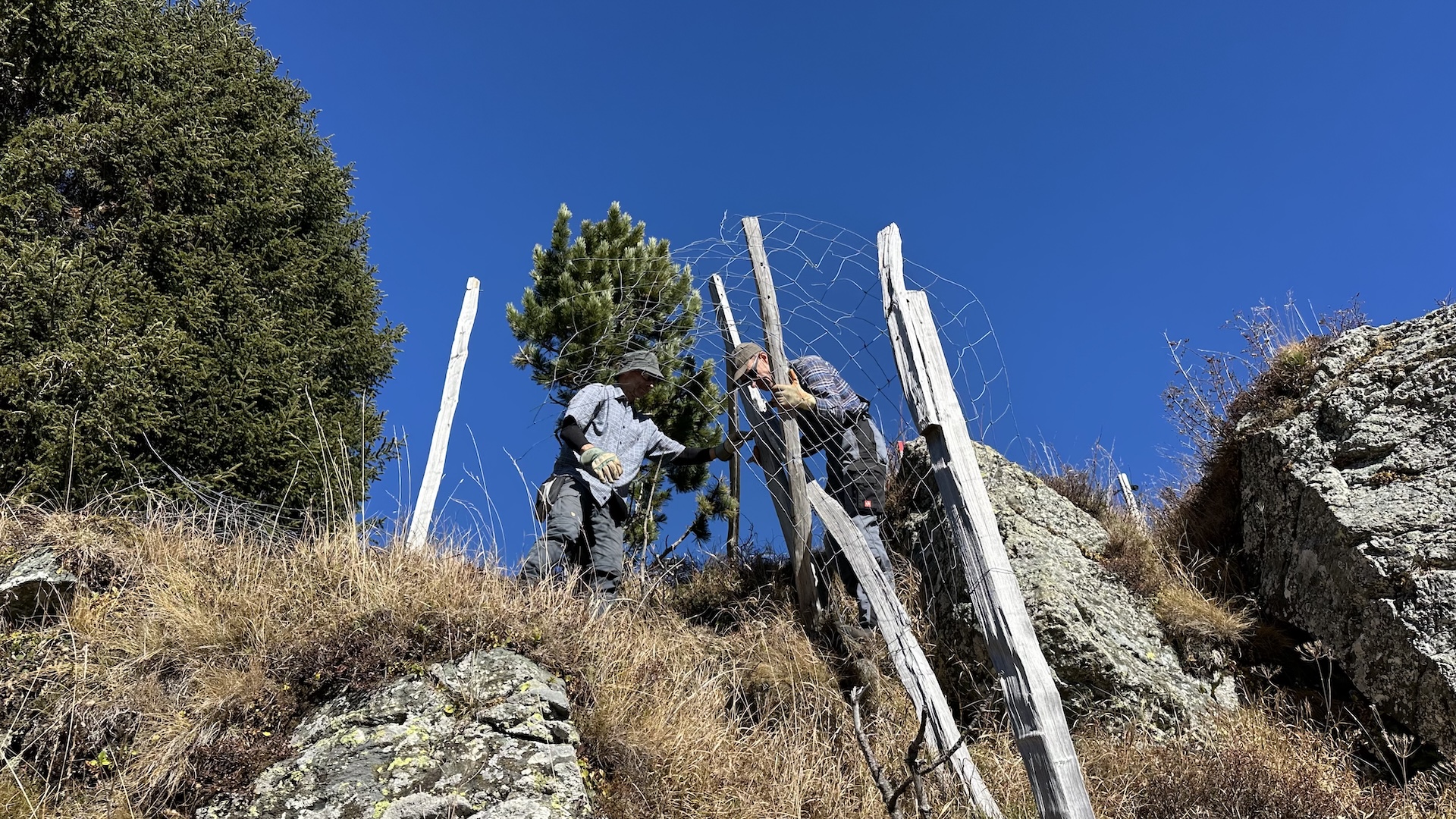 Ein strahlend schöner Herbsttag krönt unseren letzten Arbeitseinsatz. Auf dem schattigen Parkplatz in Hinterrhein treffe ich Beth, Guido, Markus und Anna - dick eingepackt und eindeutig bereit für frische Bergluft statt Ofenbänklimodus. Mit dem Skoda und einem Anhänger voll Material fahren wir hinauf auf 2000m. Schon beim anschliessenden Aufstieg über steile Wiesen begegnen wir zwei Hirschen. Kein Wunder, die Halte ist ein beliebter Treffpunkt für’s Wild. Oben angelangt warten bereits sieben Arven auf uns - allerdings ohne Schutzzaun und mit deutlich angeknabberten Ästen. Unsere Mission ist es, sie vor weiterem Wildverbiss zu schützen. Zuerst nehmen wir den alten Zaun auseinander. Die robusten Kastanienpfähle und das Maschendrahtgitter werden nicht entsorgt, sondern in bester Recycling-Manier zu neuen Einzelumzäunungen verarbeitet - Nachhaltigkeit mit einem garantiert gesunden, tiefen Schlaf. Die Arbeit im steilen, von Wacholder und Alpenrosen durchsetzten Gelände ist schweisstreibend und sorgt für so manche unfreiwillige Rutschpartie. Aber niemand verliert dabei den Humor und zumindest nicht allzu oft den Halt unter den Füssen. Wir geniessen auf dieser Höhe den Duft nach Herbst und die letzten warmen Sonnenstrahlen vor dem nahenden Winter. Die Stille der Alpen wird nur durch das Lachen und die fröhlichen Stimmen unterbrochen - ein perfekter Abschluss eines arbeitsreichen und schönen Vereinsjahres.