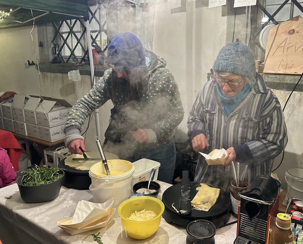 Im alten Dorfkern von Splügen, zwischen den hübschen Walserhäusern, zeigte sich der Altjahrmarkt mit Einbruch der Dunkelheit von seiner schönsten Seite. Die Besucherinnen und Besucher kamen zahlreich, probierten sich durch das vielfältige Angebot und sorgt en für eine tolle Stimmung. Auch bei unserem Crêpes-Stand bildete sich schnell eine lange Schlange. Mit grossen, glänzenden Augen verfolgten die Kinder , wie Anna und Beth den Teig mit schwungvollen Kreisbewegungen auf der heissen Platte verteilten und die Crêpes mit Nutella füllten.
